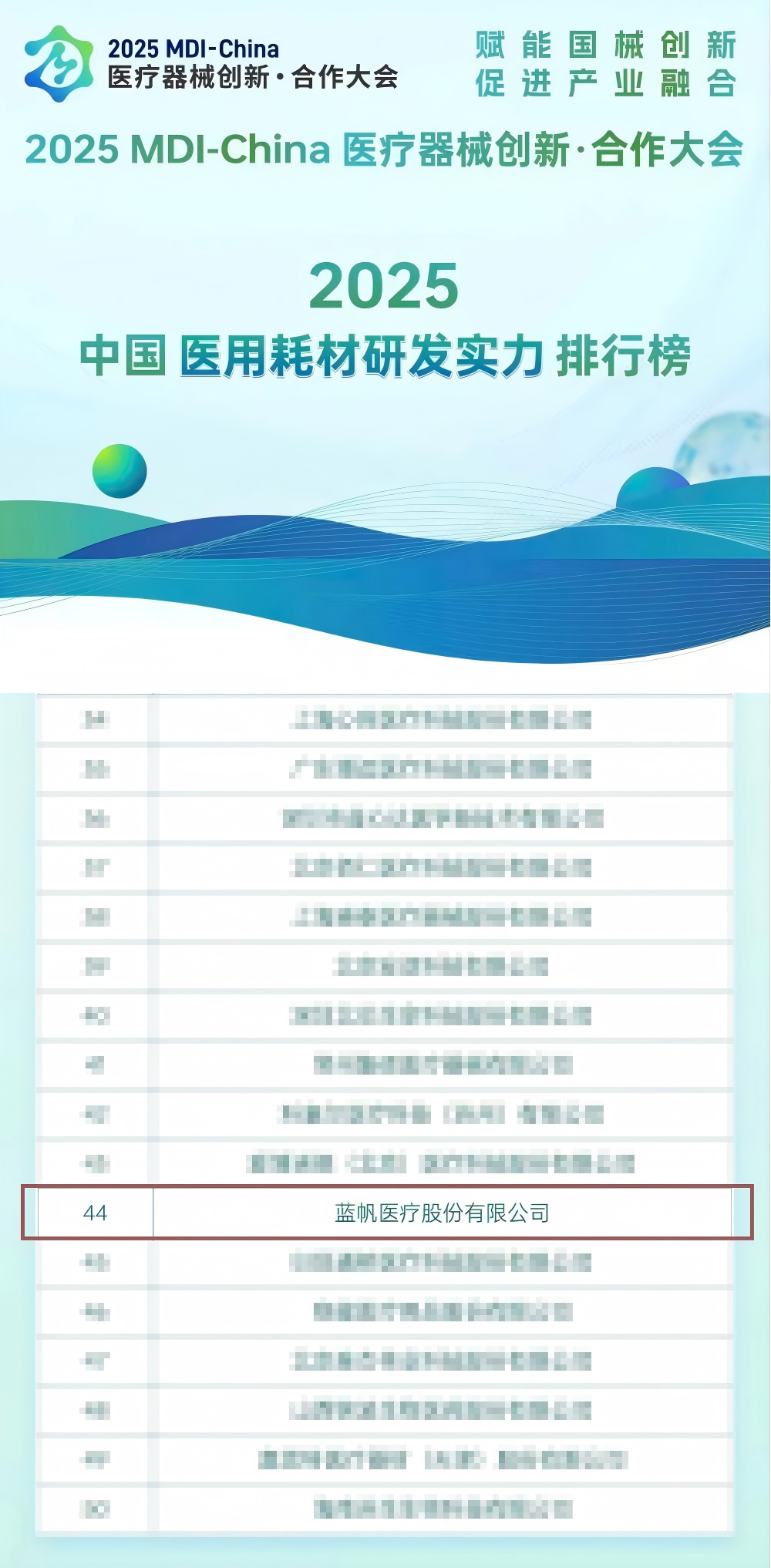10月16日,由药智网、《中国医疗设备》杂志社、重庆邮电大学联合主办的“2025MDI-China医疗器械创新·合作大会”在重庆成功举办。会上正式发布了《2025中国医用耗材研发实力排行榜》,蓝帆医疗凭借其综合研发实力,成功入选该榜单,再度印证了公司在医疗器械各细分赛道的持续创新动能与硬核技术壁垒。