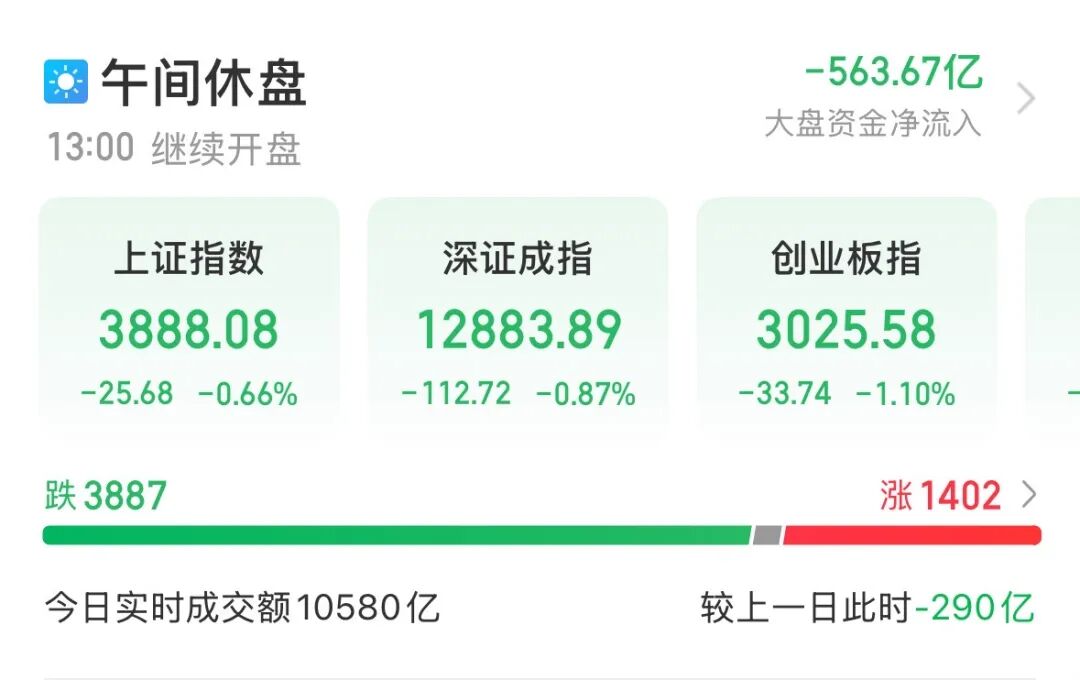 10月23日早盘,A股三大指数震荡调整。截至午间收盘,上证指数报3888.08点,跌0.66%,深证成指、创业板指分别跌0.87%、1.10%。沪深北三市全天成交10580亿元,胜宏科技成交87亿元,位居A股第一。