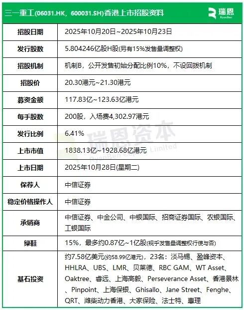 三一重工,计划全球发售5.804246亿股H股(占发行完成后总股份的6.41%,另有15%发售量调整权),其中90%为国际发售、10%为公开发售,另有15%超额配股权。每股发售价介乎20.30港元~21.30港元,每手200股,入场费4,302.97港元,最多募资约123.63亿港元。