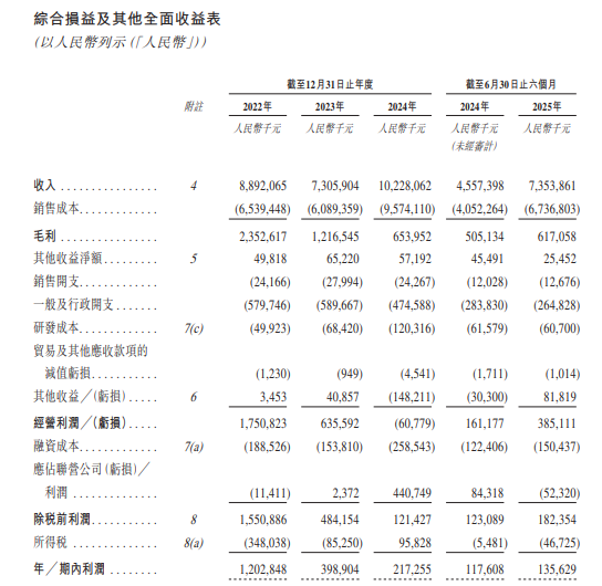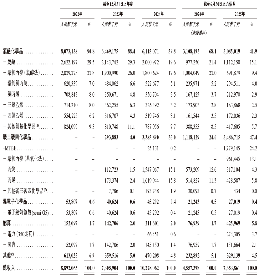 招股书显示,在过去的2022年、2023年、2024年和2025年前六个月,滨化股份的营业收入分别为人民币88.92亿、73.06亿、102.28亿和73.54亿元,相应的净利润分别为人民币12.03亿、3.99亿、2.17亿和1.36亿元。