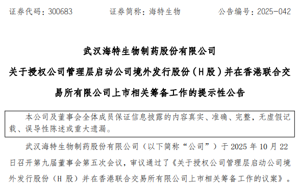 来自湖北武汉的A股上市公司海特生物(300683.SZ)发布公告称,为深化公司全球化战略布局,加快海外业务发展,提升公司国际化品牌形象,同时打造多元化资本运作平台,增强公司的境外融资能力,助力公司高质量发展,根据公司总体发展战略及运营需要,公司拟在境外发行股份(H股)并在港交所上市。