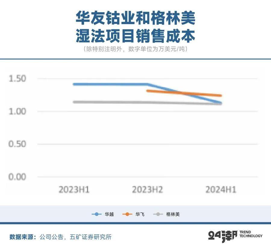 五矿证券根据公司披露业绩倒算,华越项目2023年上半年销售成本约1.4万美元/吨,2024年上半年降至1.13万美元/吨;华飞项目2023年刚投产,2023年下半年成本1.31万美元/吨,2024年降至1.24万美元/吨。格林美湿法项目成本维持在1.1万美元/吨附近。