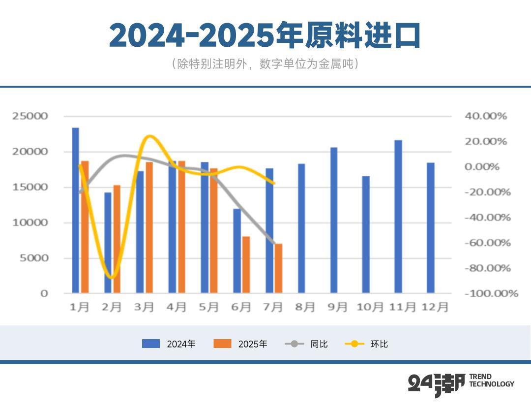 另外据海关数据及安泰科测算,2025年7月中国钴原料进口约7053金吨,同比下跌60.12%,环比下跌12.72%。其中钴湿法中间进口约4143金吨,同比减少72.6%,环比下跌27.3%。2025年1-7月中国钴原料进口量约为10.4万金吨,累计同比减少14.69%。