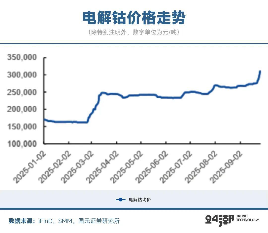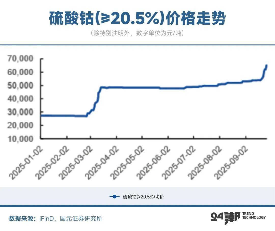供应紧张迅速反映在价格上。截至9月底,电解钴均价为310,000元/吨,近2周上涨13.55%,年初至今上涨116.78%;硫酸钴(≥20.5%)均价为65,000元/吨,近2周上涨20.82%,年初至今上涨138.10%。