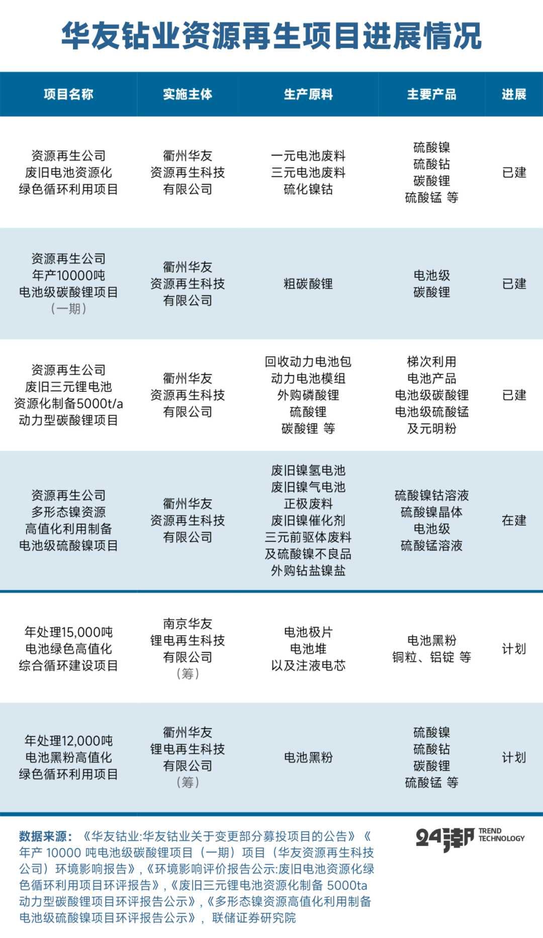 作为钴资源龙头之一,华友钴业也在积极布局锂电池循环回收业务,形成锂电材料闭环。公司通过回收网络体系建立、梯次利用开发、资源化利用、废料换材料和电池维修维护再制造等商业模式创新,与宝马、大众、丰田、LG新能源、一汽、长安、广汽、上汽、蔚来、理想等国内外主流汽车生产企业及电池领军企业开展广泛合作,为客户提供全球化、无害化且可持续的废旧电池解决方案。如下表所示为公司再生项目进展情况。