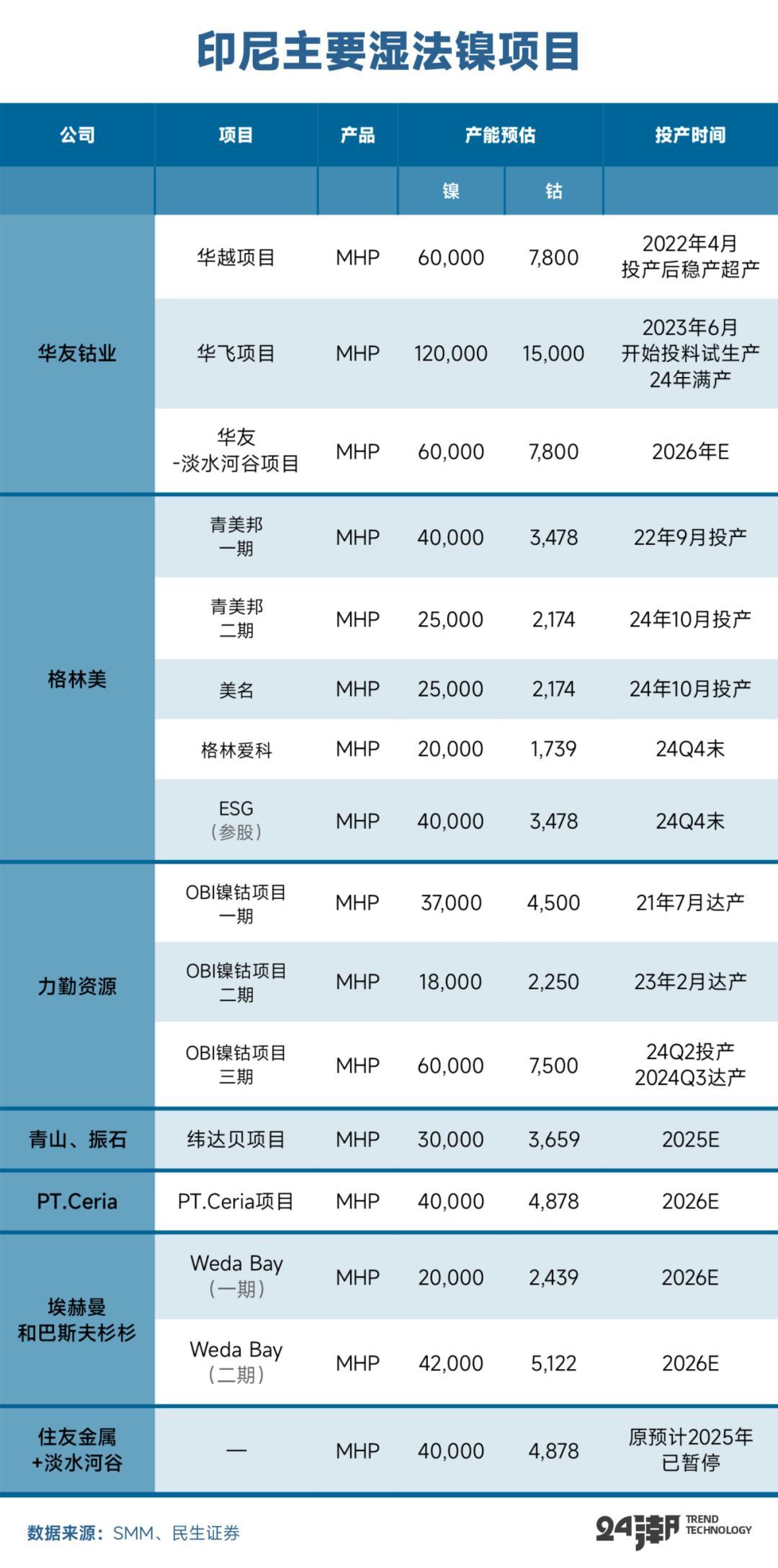 此外,2024年9月,力勤资源HPAL湿法三期ONC项合计3条生产线,总计年设计产能为6.5万金属吨MHP(镍钴化合物)达产,加上公司湿法一期二期5.5万吨产能,公司湿法合计产能达12万吨。