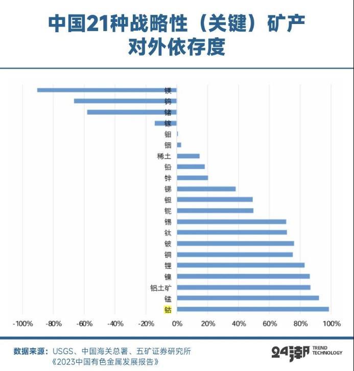 五矿证券数据显示,中国钴矿对外依存度达98.41%。