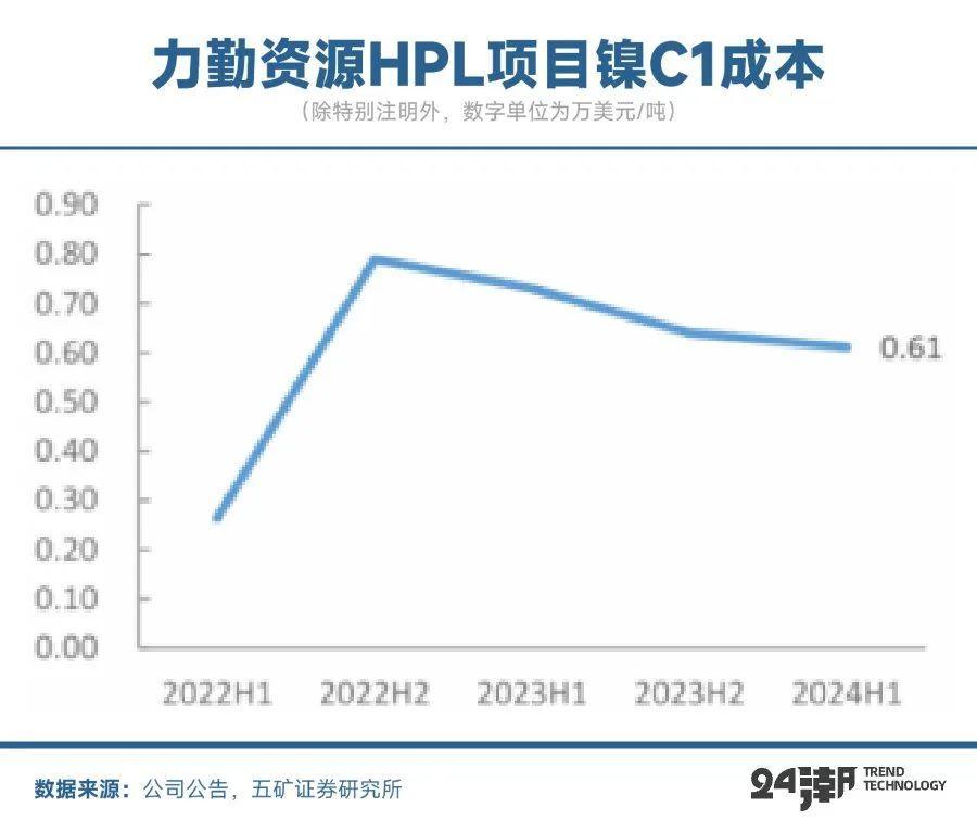 比如根据五矿证券的数据,以力勤资源为例,所用红土镍矿镍钴比10:1,钴营收作为镍成本抵扣,根据Hairita披露的钴金属价格较高的2022年上半年镍C1成本最低达到了0.26万美元/吨,随着钴价回落以及红土镍矿原料价格上涨,2024年上半年抵扣后C1成本达到0.61万美元/吨。