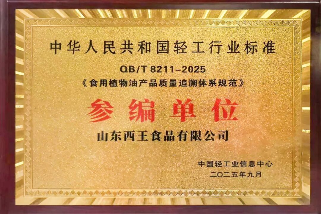 近日,由中国轻工业信息中心牵头制定的《食用植物油产品质量追溯体系规范》(QB/T 8211-2025)正式落地,这是我国食用植物油行业首个聚焦产品质量追溯的行业标准,填补了行业追溯标准空白。作为粮油行业领军企业,西王食品深度参与标准编制,以实践经验为行业规范化发展注入“西王力量”,彰显头部企业守护食品安全、推动产业升级的责任担当。
