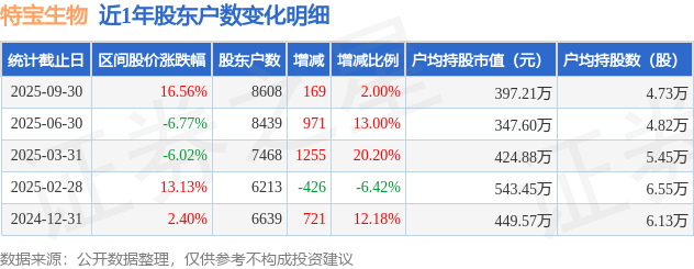 证券之星消息,近日特宝生物披露,截至2025年9月30日公司股东户数为8608.0户,较6月30日增加169.0户,增幅为2.0%。户均持股数量由上期的4.82万股减少至4.73万股,户均持股市值为397.21万元。