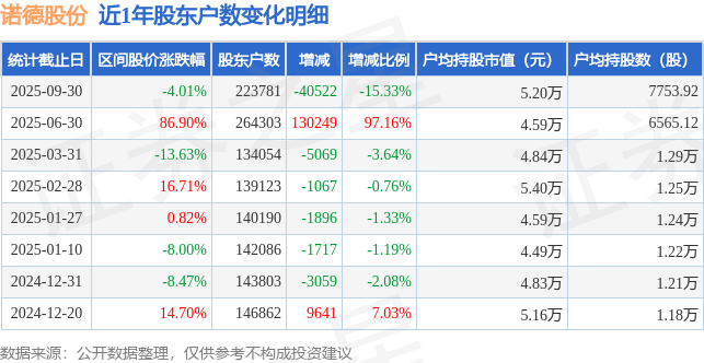 证券之星消息,近日诺德股份(维权)披露,截至2025年9月30日公司股东户数为22.38万户,较6月30日减少4.05万户,减幅为15.33%。户均持股数量由上期的6565.0股增加至7754.0股,户均持股市值为5.2万元。
