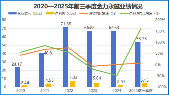 2025年前三季度,金力永磁实现营收53.73亿元,同比增长7.16%;实现净利润5.15亿元,已远超2024年全年水平,扣非净利润同比增速更是飙到381.94%。