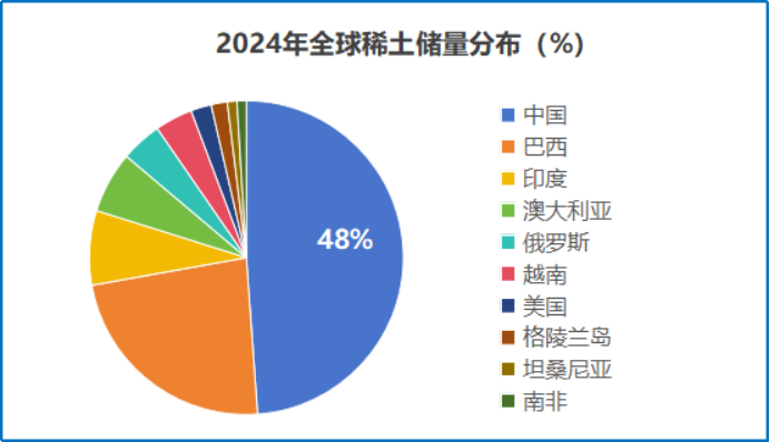 而这一战略资源,近一半都在我国手里。2024年我国稀土储量4400万吨,占全球稀土储量的48%,位居全球第一。