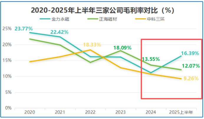 2025年上半年,金力永磁毛利率率先回升至16.39%,正海磁材、中科三环却仍在下滑;净利率方面,金力永磁达8.82%,比后两者高出5个百分点以上。