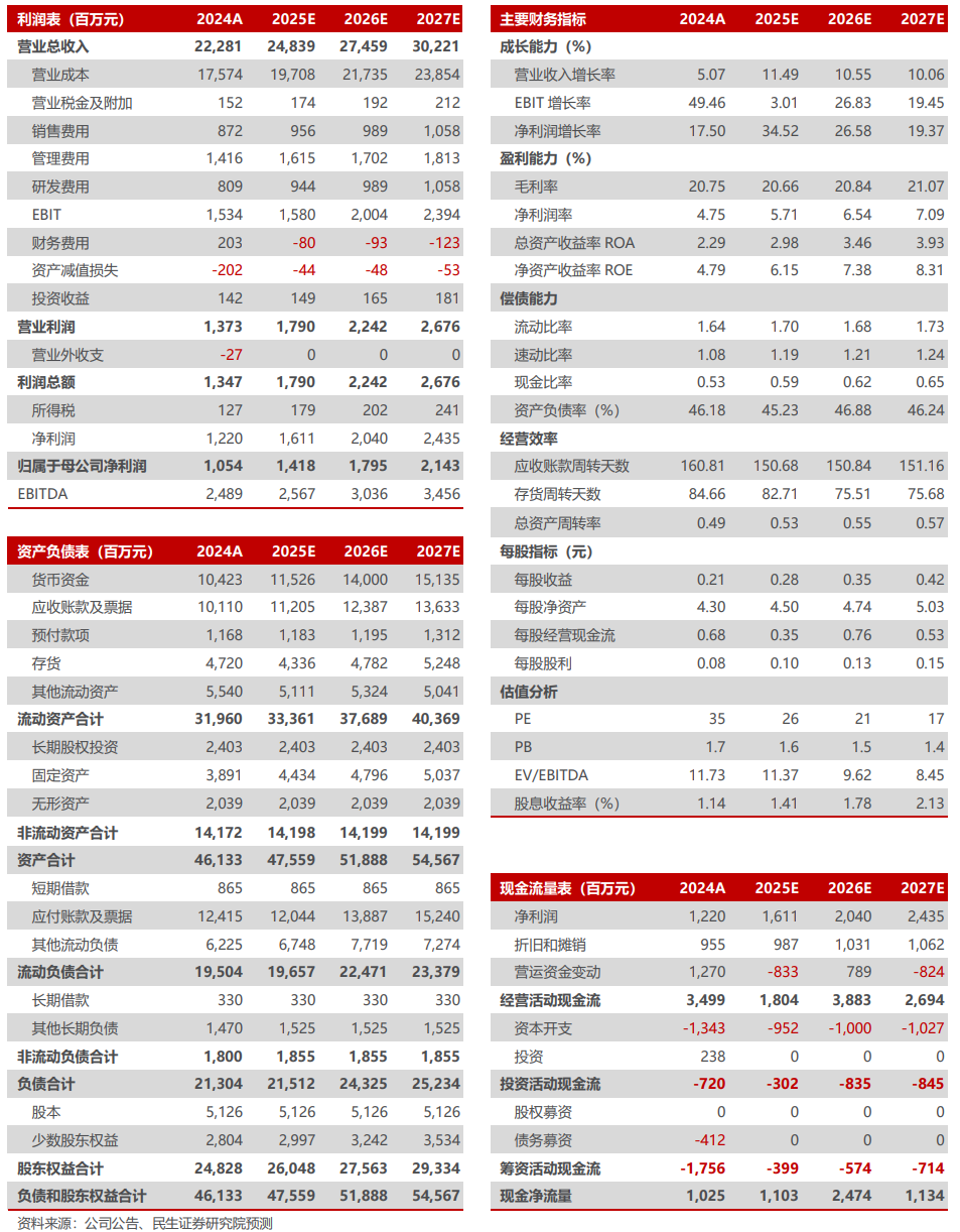 ■ 投资建议:我们预计公司2025-2027年营收分别为248.39、274.59、302.21亿元,对应增速分别为11.5%、10.5%、10.1%;归母净利润分别为14.18、17.95、21.43亿元,对应增速分别为34.5%、26.6%、19.4%,以10月21日收盘价为基准,对应2025-2027年PE为 26X、21X、17X,公司为国内一次设备龙头,受益于全球电网基建周期且积极拓展网外市场,维持“推荐”评级。