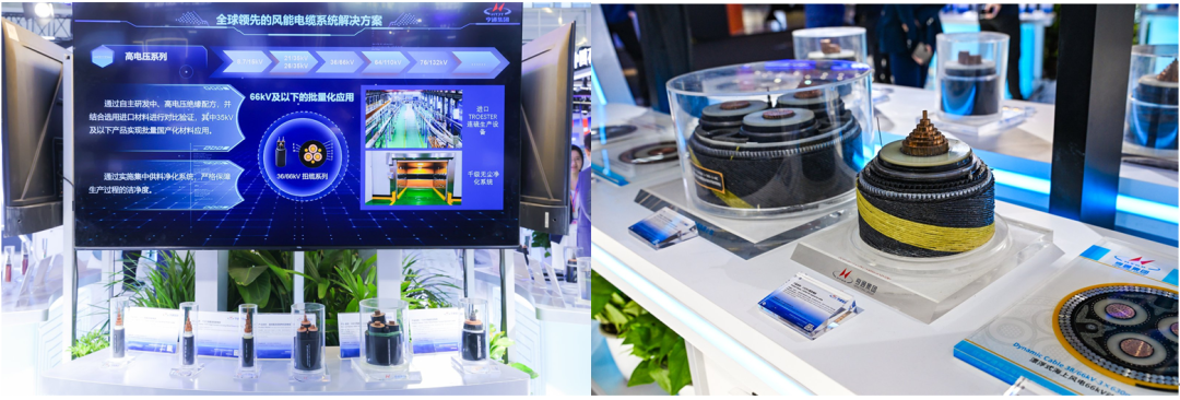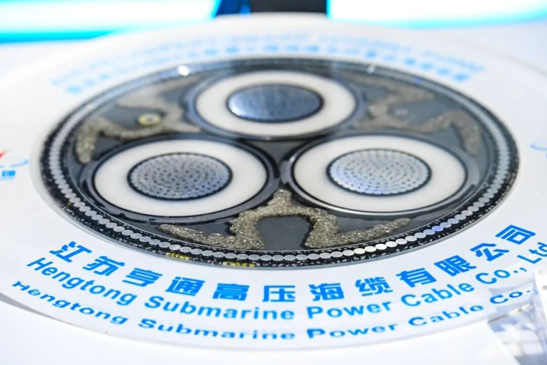 北极星看到,亨通展示了全球首根自主研发的132kV风能抗扭软电缆,可应用于20MW及以上超大功率风电机组中;也见到了超高压海缆交流500kV 3×1800mm²、直流±535kV 1×3000mm²等代表行业顶尖水平的产品。
