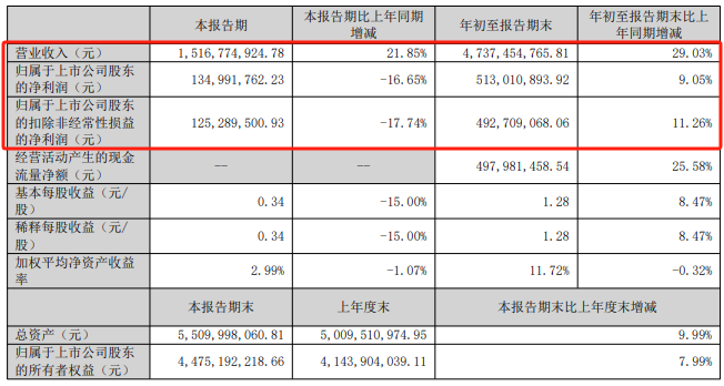 但拆开Q3单季数据,“隐忧”直接藏不住了——营收15.17亿元同比涨21.85%,净利润却反向跌了16.65%,扣非归母净利润1.25亿元也跌了17.74%。