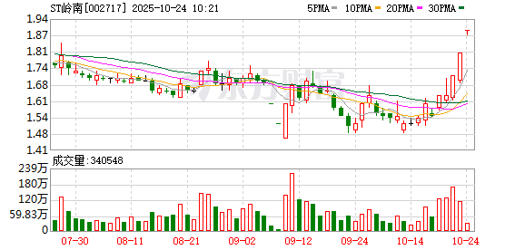 ST岭南(维权)再度涨停,5个交易日内录得4个涨停,累计涨幅为21.94%,累计换手率为33.75%。截至9:29,该股今日成交量1082.71万股,成交金额2046.32万元,换手率0.67%。最新A股总市值达34.40亿元,A股流通市值30.53亿元。(数据宝)