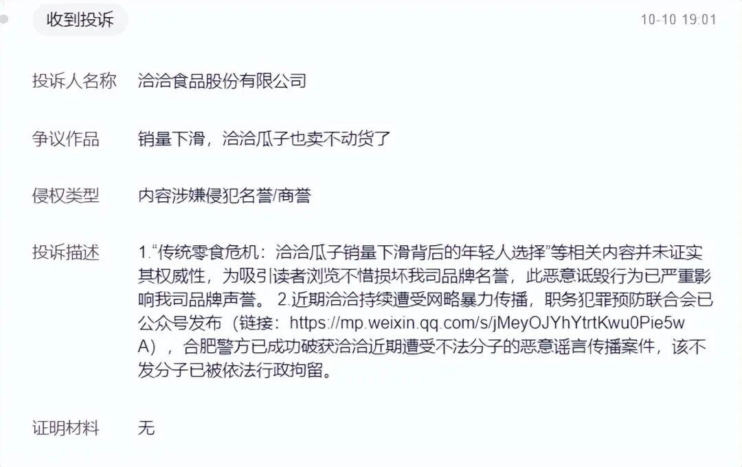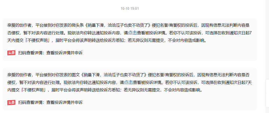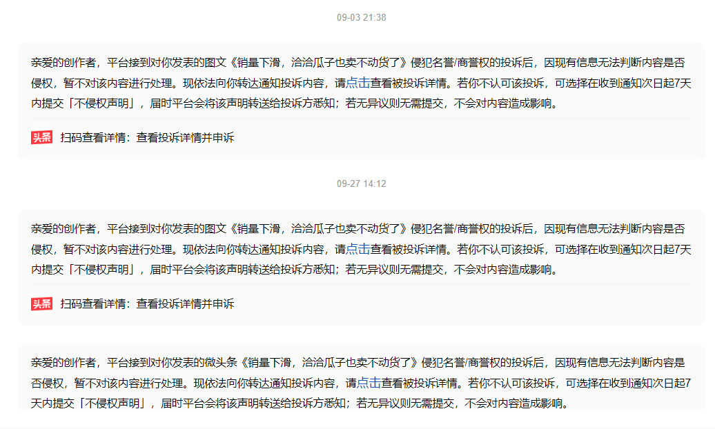 于是,洽洽在9月3号投诉之后,又在9月27号、10月10号继续投诉了我两次;当然,那篇文章还好好地活着,对于这种乱扣帽子的投诉,平台怎么可能做处理。