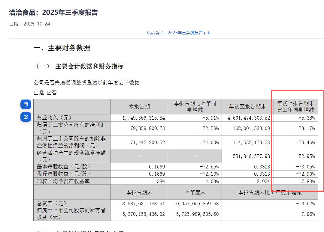 今天看公告,今年前三季度,洽洽营收同比下降5.38%,扣非净利同比下滑79.46%,现金流同比下降52.96%。