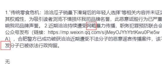 近期洽洽持续遭受网络暴力传播,合肥警方已成功破获洽洽近期遭受不法分子的恶意谣言传播案件,该不法分子已被依法行政拘留。