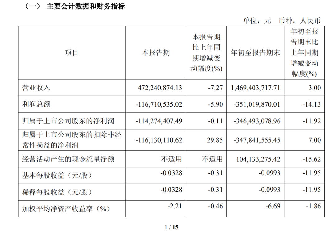 报告显示,公司第三季度营业收入4.72亿元,同比下降7.27%,亏损1.14亿元。前三季度营业收入14.69亿元,同比增长3%;归母净利润亏损3.46亿元,亏损同比扩大11.6%。
