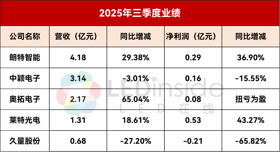 近日,朗特智能、中颖电子、奥拓电子、莱特光电、久量股份公布三季度业绩,瑞联新材则发布前三季度业绩预增公告。