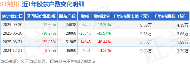 从股价来看,2025年6月30日至2025年9月30日,ST纳川区间跌幅为12.6%,在此期间股东户数减少3422.0户,减幅为12.2%。