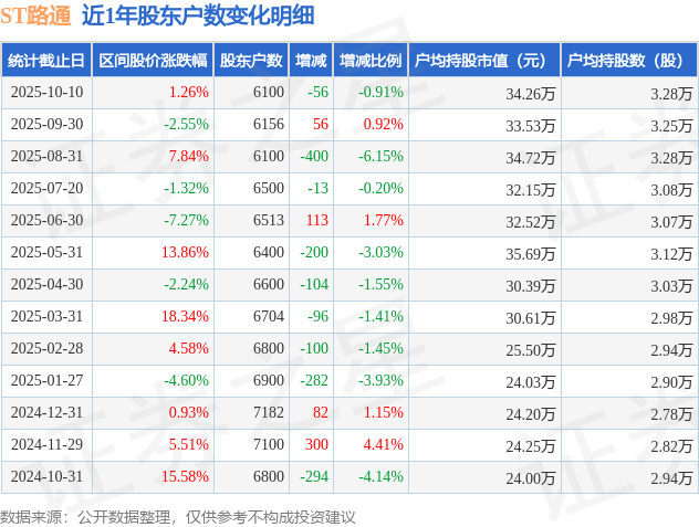 从股价来看,2025年9月30日至2025年10月10日,ST路通区间涨幅为1.26%,在此期间股东户数减少56.0户,减幅为0.91%。