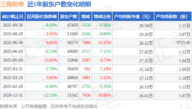 从股价来看,2025年8月20日至2025年9月30日,三角防务区间跌幅为8.93%,在此期间股东户数减少3550.0户,减幅为6.96%。