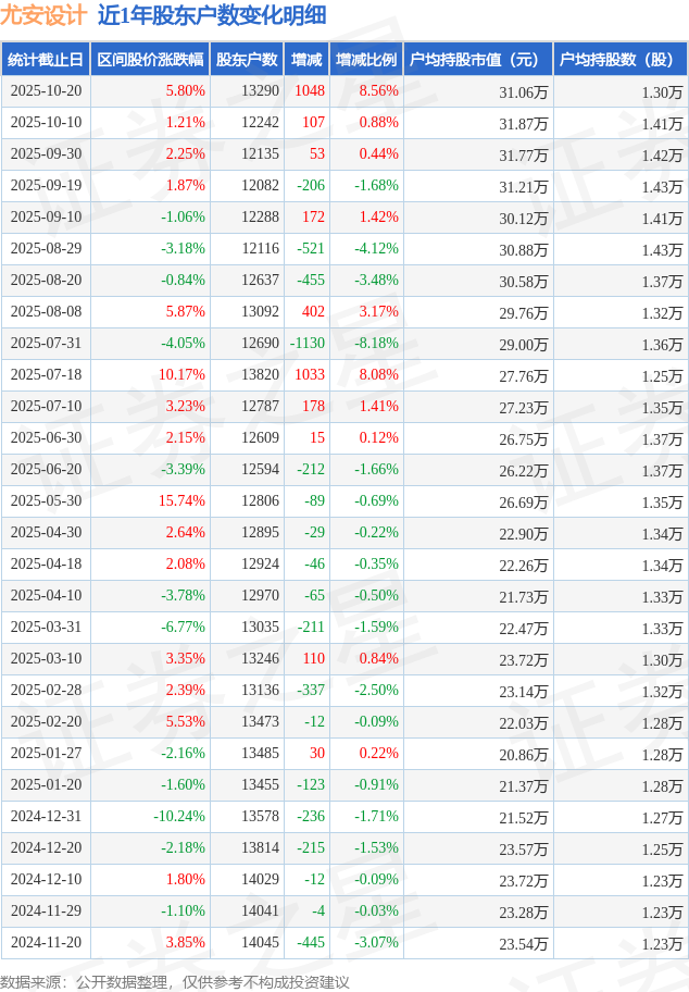 从股价来看,2025年10月10日至2025年10月20日,尤安设计区间涨幅为5.8%,在此期间股东户数增加1048.0户,增幅为8.56%。