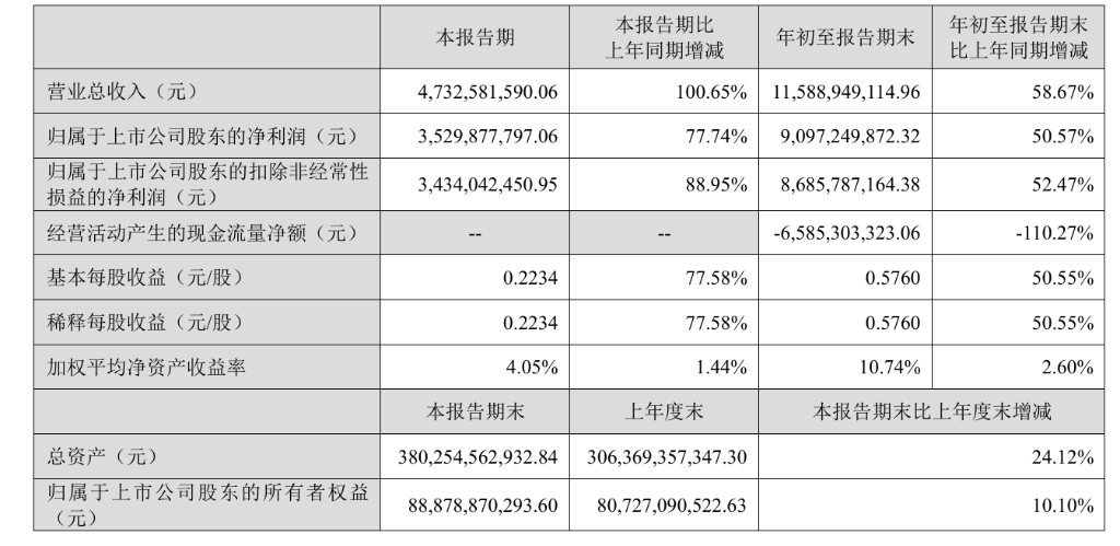 - 归属于上市公司股东的净利润35.30亿元人民币,同比增长77.74%;