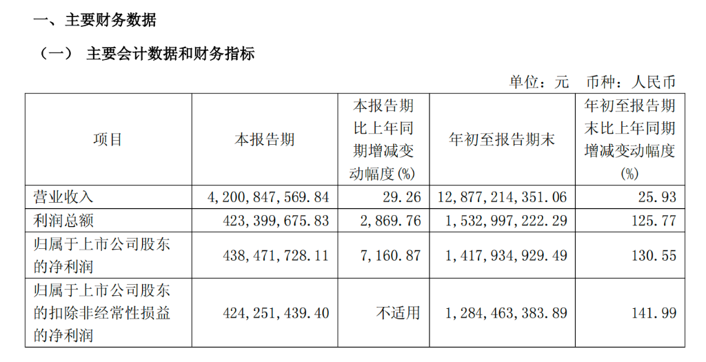 - Q3单季营收42.01亿元,同比增长29.26%;净利润4.38亿元,同比暴增7160.87%