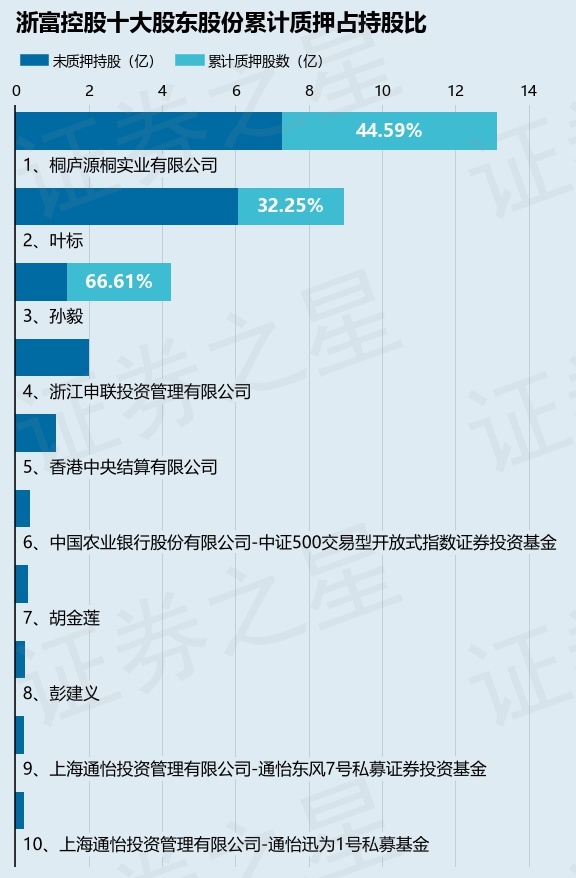 截止本公告日,股东桐庐源桐实业有限公司已累计质押股份5.85亿股,占其持股总数的44.59%,股东叶标已累计质押股份2.89亿股,占其持股总数的32.25%,股东孙毅已累计质押股份2.82亿股,占其持股总数的66.61%。本次质押后浙富控股十大股东的累计质押股份占持股比例(占持股比例的计算以公司最新一期财务报表公布的十大股东的持股总数为基准)见下图: