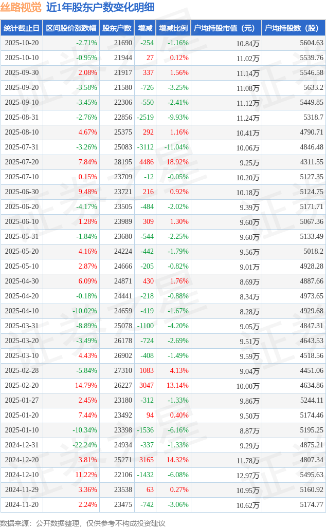 从股价来看,2025年10月10日至2025年10月20日,丝路视觉区间跌幅为2.71%,在此期间股东户数减少254.0户,减幅为1.16%。