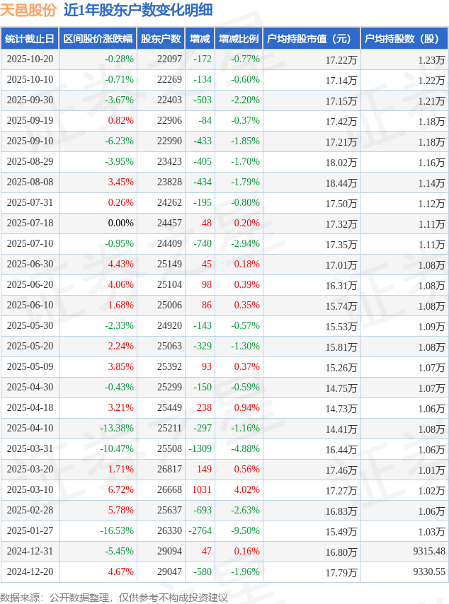 从股价来看,2025年10月10日至2025年10月20日,天邑股份区间跌幅为0.28%,在此期间股东户数减少172.0户,减幅为0.77%。