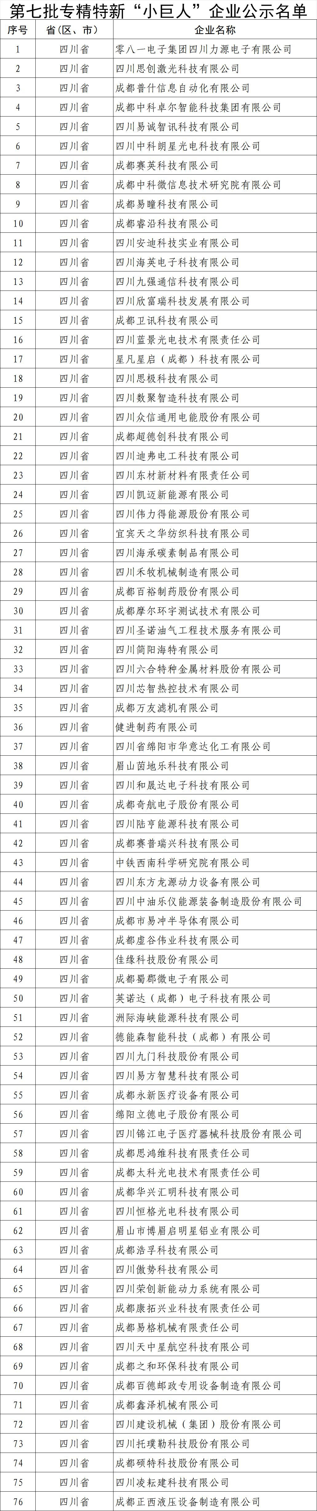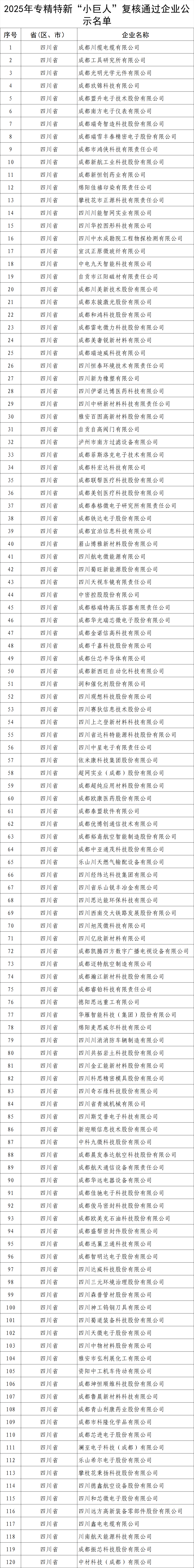 10月20日,四川省经济和信息化厅公示四川省第七批专精特新“小巨人”企业和2025年专精特新“小巨人”复核通过企业名单,公示时间为2025年10月20日至10月24日。