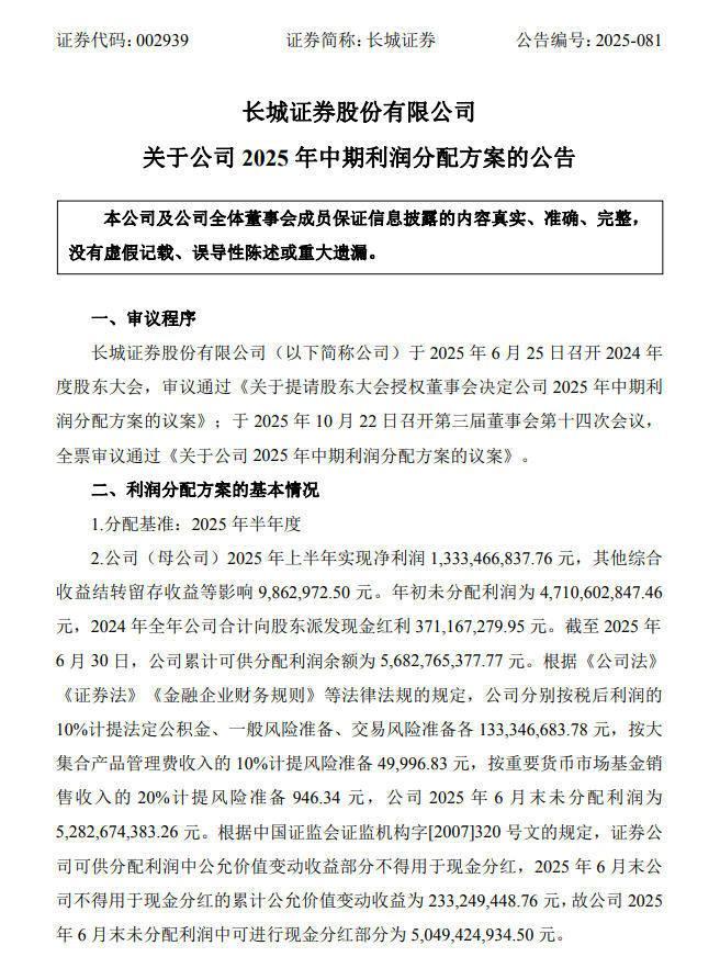 10月22日,长城证券股份有限公司(002939.SZ,下称“长城证券”)发布公告称,董事会审议通过《关于公司2025年中期利润分配方案的议案》,以现有总股本40.34亿股为基数,向全体股东每10股派发现金红利0.76元(含税),合计派发3.07亿元。