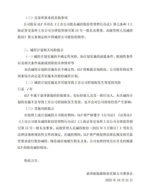 10月20日,嘉泽新能(601619)发布关于持股 5%以上股东减持股份计划公告。