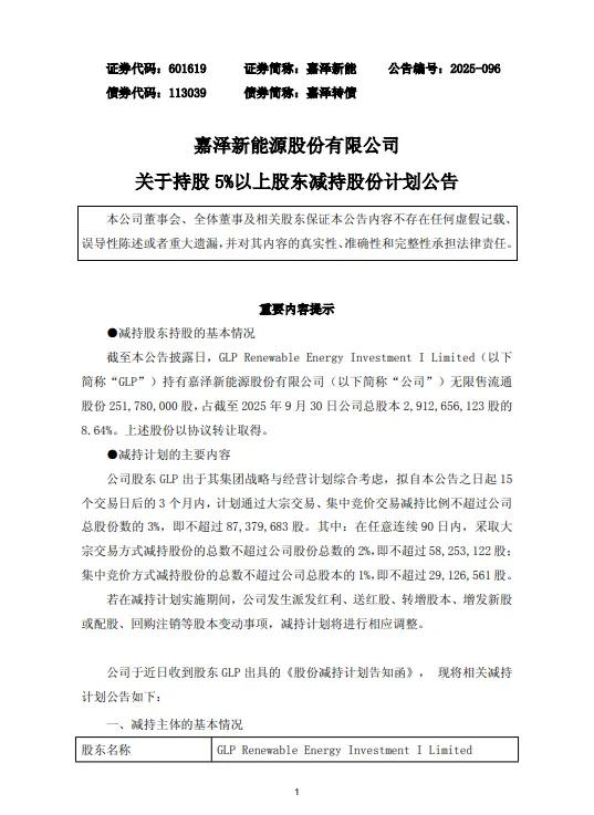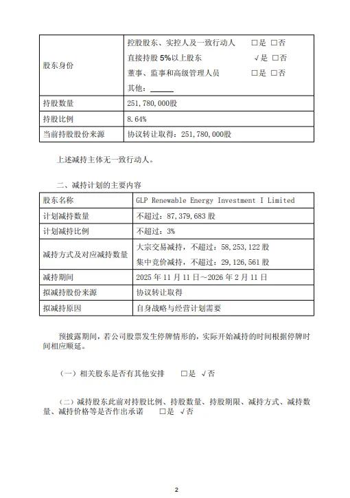 截至本公告披露日,GLP Renewable Energy Investment I Limited(以下简称“GLP”)持有公司无限售流通股份 251,780,000 股,占截至 2025 年 9 月 30 日公司总股本2,912,656,123 股的8.64%。上述股份以协议转让取得。