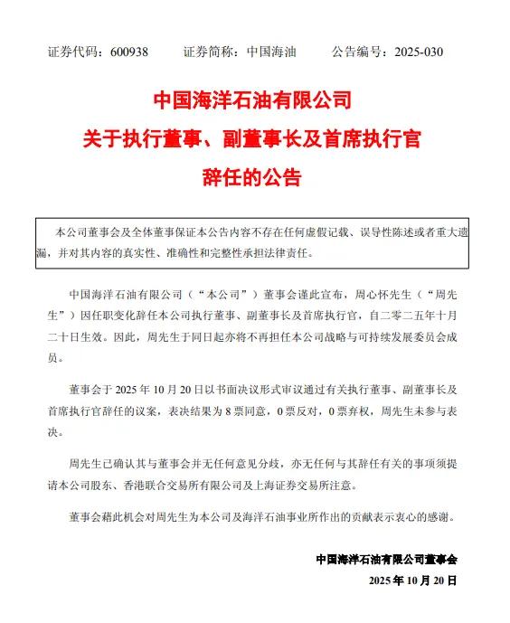 10月20日,中国海油(600938)公告称,公司董事会谨此宣布,周心怀先生(“周先生”)因任职变化辞任本公司执行董事、副董事长及首席执行官,自二零二五年十月二十日生效。因此,周先生于同日起亦将不再担任本公司战略与可持续发展委员会成员。