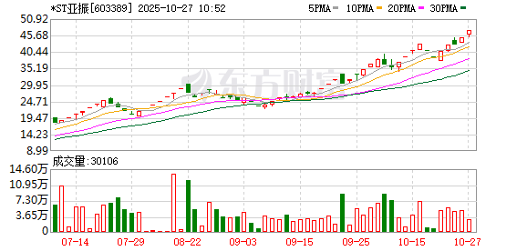 *ST亚振再度涨停,5个交易日内录得4个涨停,累计涨幅为21.58%,累计换手率为8.81%。截至10:07,该股今日成交量240.44万股,成交金额1.11亿元,换手率0.92%。最新A股总市值达123.91亿元。