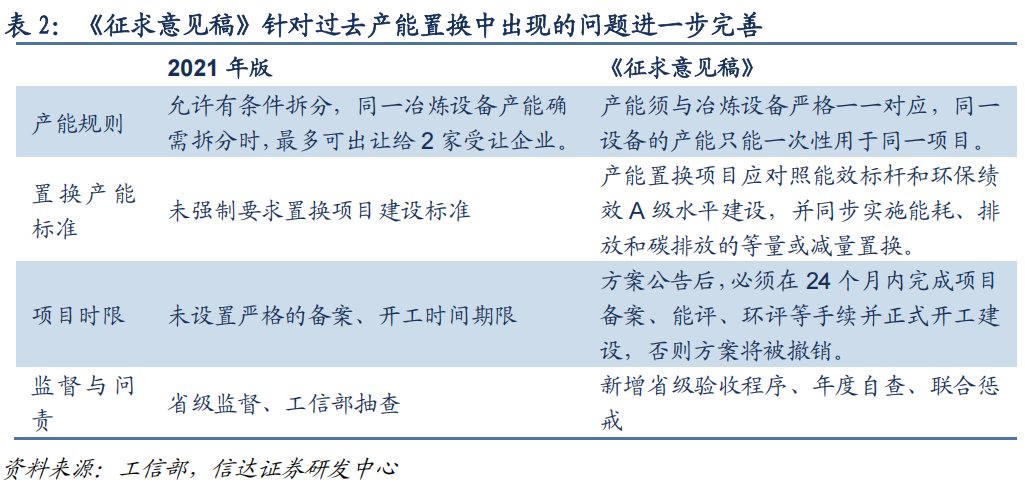 针对过去产能置换中出现的问题,《征求意见稿》针对性完善了监管政策。(1)要求所置换产能必须一次性使用,堵住因单项产能反复拆分带来的总量反弹乱象。《征求意见稿》明确提出,炼铁、炼钢产能须与冶炼设备严格一一对应,不能将冶炼设备和产能分离,同一冶炼设备的炼铁、炼钢产能只能一次性用于同一项目使用。在2021年版方案中,允许拆分至多2家受让企业。(2)产能置换项目应对照能效标杆和环保绩效A级水平建设,杜绝“低水平重复建设”。发改委在办理项目环评、排污许可证、节能审查和碳排放评价等相关手续时,同步实施主要污染物排放、能源消耗和碳排放等量或减量置换(置换比例与产能置换比例相同),由产能转入地统筹压减现有指标,为新建项目腾出置换空间。(3)严格项目备案、开工时限,过期撤销产能置换方案。《征求意见稿》提出,对2024年8月23日之前已经公告的产能置换方案,自本办法实施之日起24个月内须完成项目备案、节能审查和碳排放评价、环评,且正式开工建设。超出时限的,将被撤销原产能置换方案。该举措或有效防止企业恶意囤积产能置换指标等现象,倒逼项目和产能退出同步高效推进。(4)强化监督管理,新增省级验收程序、年度自查、联合惩戒。《征求意见稿》明确,项目建成投产前,建设项目所在地省级工业和信息化主管部门负责组织产能置换项目验收。省级工业和信息化主管部门应按年度开展钢铁产能置换项目执行情况自查,并形成自查报告于每年 12 月 31 日前报送工业和信息化部。工业和信息化部对钢铁产能置换过程中存在弄虚作假行为并导致不良社会影响的企业、设计咨询单位等,依法实施联合惩戒。