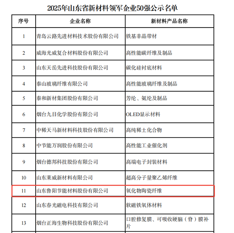 近日,山东省工业和信息化厅公示2025年山东省新材料领军企业培育库入库企业及50强名单,山东鲁阳节能材料股份有限公司凭借在氧化物陶瓷纤维领域的研发实力和卓越成绩,成功入选培育库并跻身50强之列。