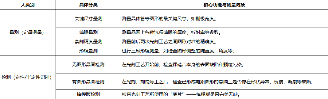 从市场结构来看,半导体检测和量测设备呈现明显的细分领域分化。根据VSLIResearch的统计,检测设备占比62.6%,是市场的主导板块,包括无图形晶圆缺陷检测设备、图形晶圆缺陷检测设备、掩膜检测设备等,直接关系到芯片制造过程中的缺陷筛查与良率控制;量测设备占比为33.5%,涵盖三维形貌量测设备、薄膜膜厚量测设备、套刻精度量测设备等,聚焦于关键尺寸与工艺参数的精准把控。
