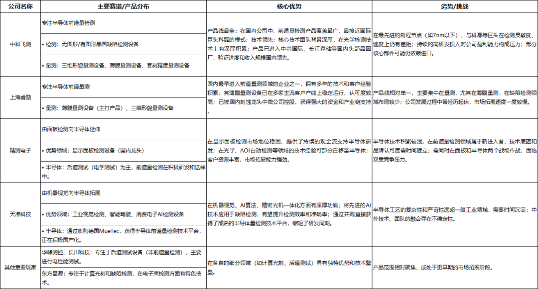 精测电子则凭借跨界优势强势入局。作为显示面板检测设备的绝对龙头,精测电子拥有雄厚的资金实力,稳定的面板业务为其半导体业务提供了强大的现金流支撑,同时其在光学检测、自动化控制等领域的技术积累可实现跨领域协同。目前公司产品已涵盖膜厚量测、关键尺寸量测、电子束缺陷检测等多个品类,其中明场设备已完成首台套交付,与国内主流晶圆厂建立了合作关系。不过,作为半导体领域的新进入者,其在前道量检测核心技术的沉淀深度与国际品牌的认可度仍有待提升,面临面板业务与半导体业务双线作战的激烈竞争压力。