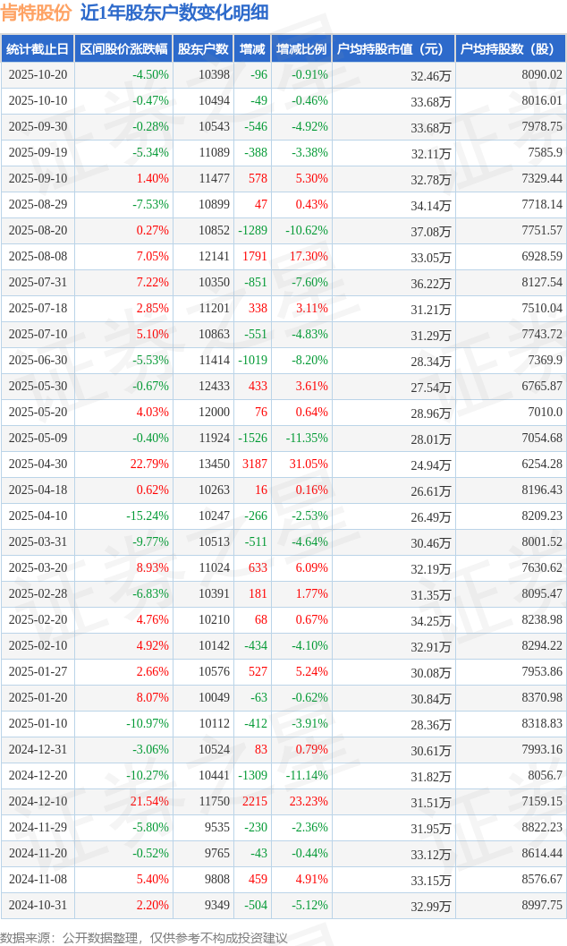 从股价来看,2025年10月10日至2025年10月20日,肯特股份区间跌幅为4.5%,在此期间股东户数减少96.0户,减幅为0.91%。