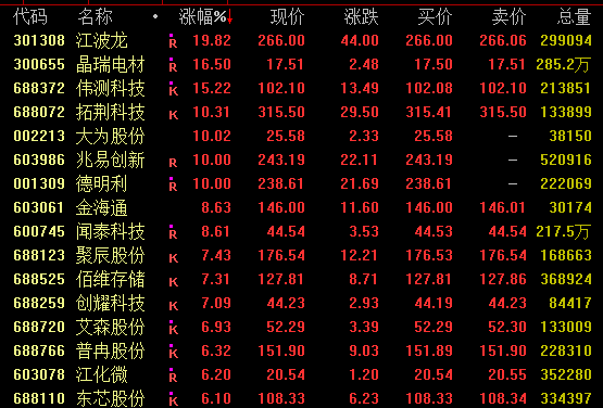 半导体、芯片等科技类股今日再度飙升,光刻机、存储芯片概念等表现亮眼。截至收盘,江波龙逼近涨停,晶瑞电材涨超16%,兆易创新、德明利亦涨停,佰维存储涨超7%,华虹公司涨近5%。值得注意的是,江波龙、兆易创新、德明利、佰维存储盘中集体创出新高。