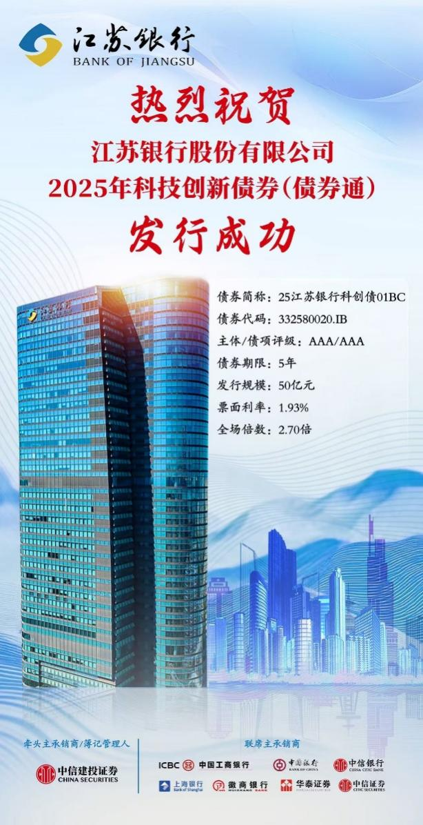 2025年10月21日,中国外汇交易中心支持江苏银行通过交易中心发行系统在银行间市场成功簿记发行2025年科技创新债券(债券通),发行规模50亿元,债券期限5年,主体与债项评级均为AAA,票面利率1.93%,全场认购倍数达2.70倍。本期债券的募集资金将投向《金融“五篇大文章”总体统计制度(试行)》中规定的科创领域,包括发放科技贷款、投资科技创新企业发行的债券等,专项支持科技创新领域业务。