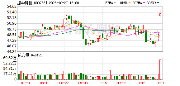 证券时报·数据宝统计显示,振华科技今日收盘价为53.13元,上涨8.76%,日换手率为11.67%,成交额为34.49亿元,全天主力资金净流入3.48亿元,近5日该股累计上涨12.66%,近5日资金合计净流入3.23亿元。